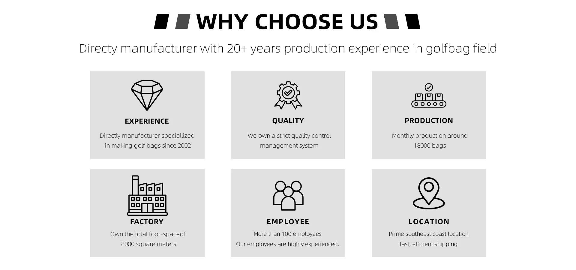 Prodotti principali: Sacca da Golf, copricapo da Golf, borsa da viaggio da Golf, borsa da Golf, mazza da Golf